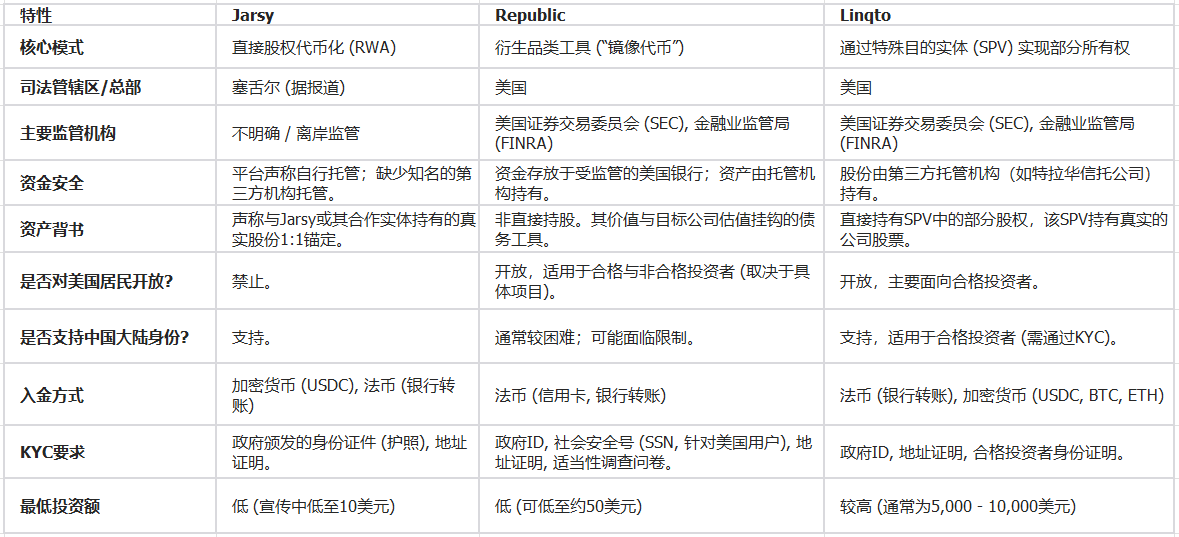 - Republic & Linqto: 在美国受到监管,这极大地降低了此项风险。它们在严格的法律框架下运营,对于欺诈或管理不善有明确的法律后果。